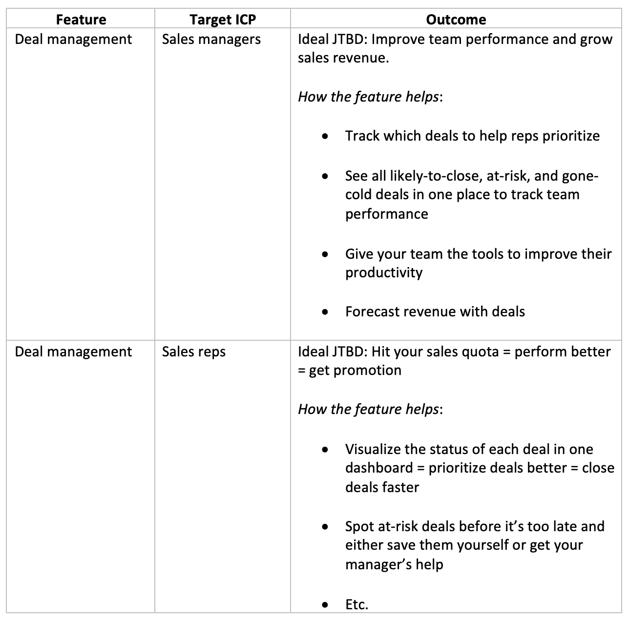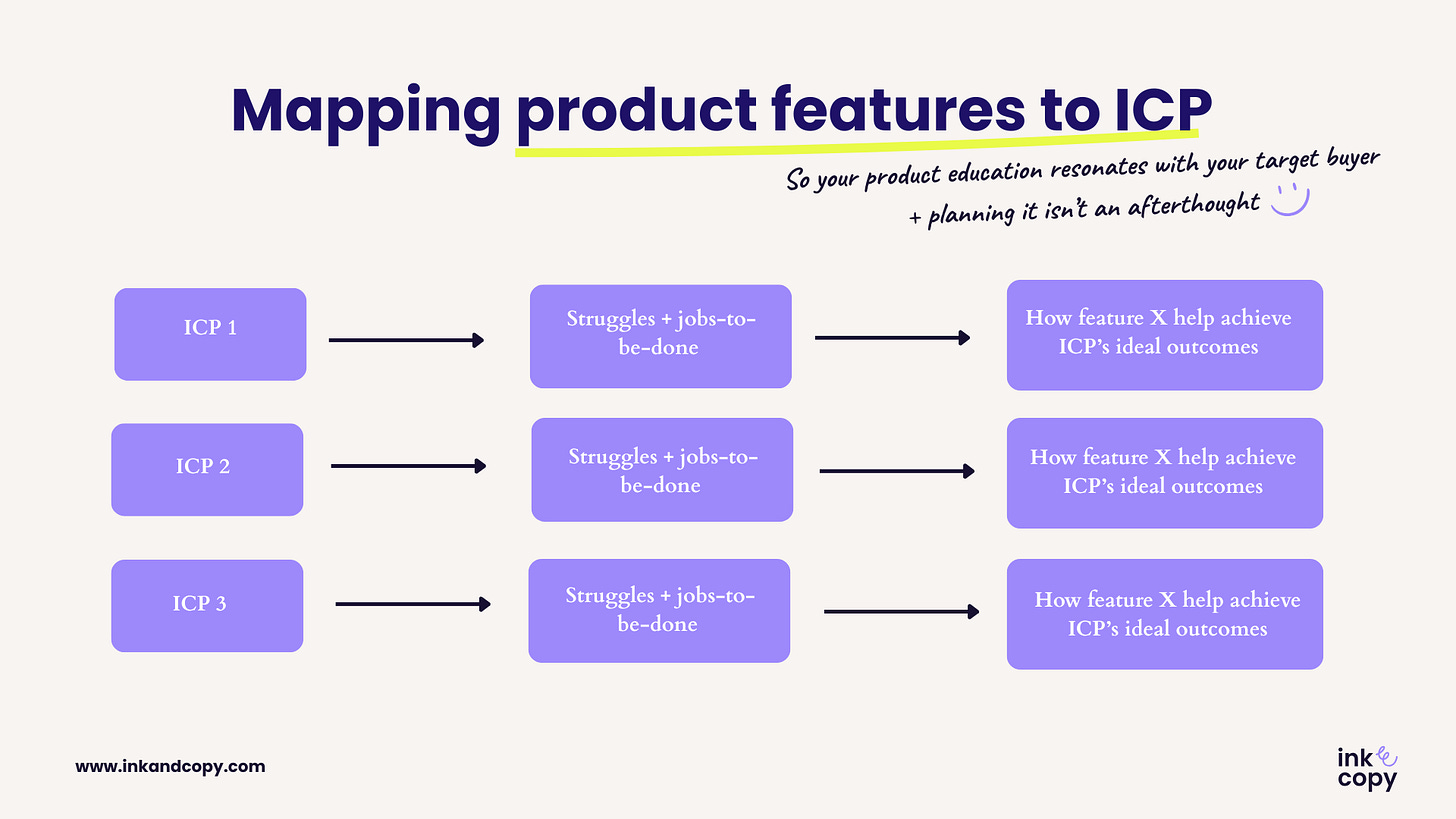 Since you’ve done all the legwork in understanding how each feature maps out to each ICP’s pain points and desired outcomes, you can write content that speaks to them 🎯